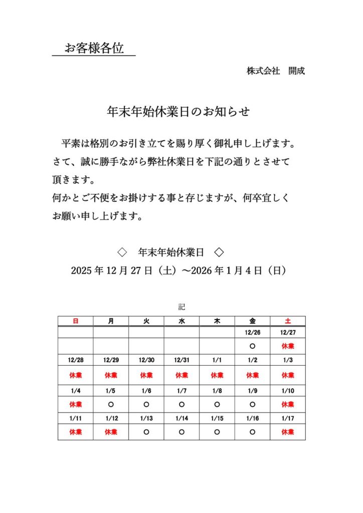NEWS 2025年 年末年始 休業案内 2025.12.01 戻る お知らせ 事業所案内 会社紹介 レンタル取引規約 レンタル手続き方法 ワイド補償のご案内 レンタカー貸渡約款 レンタカーについて レンタル契約約款 SNSアカウント